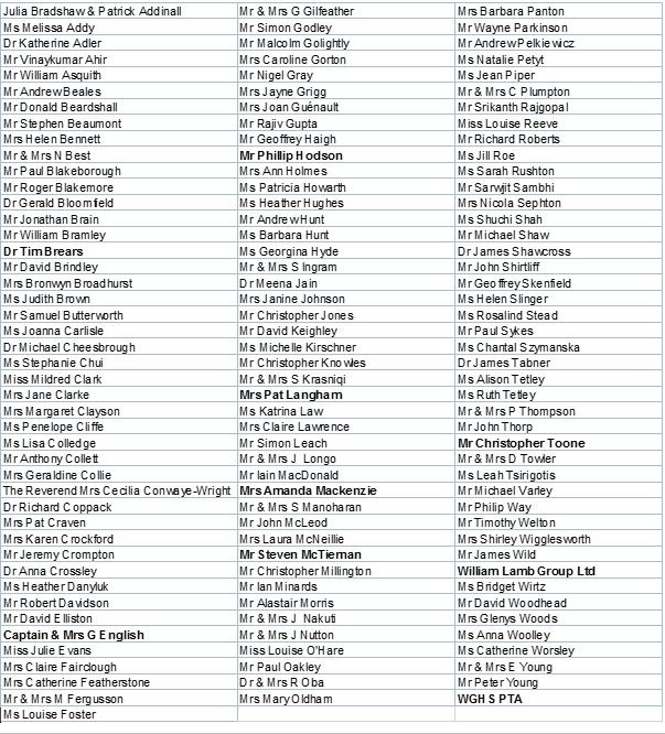The Foundation Donors listed have pledged or made a gift to the Foundation schools. Whilst we endeavour to ensure that these lists are correct, we apologise if there are any inaccuracies. Please let us know if this is the case